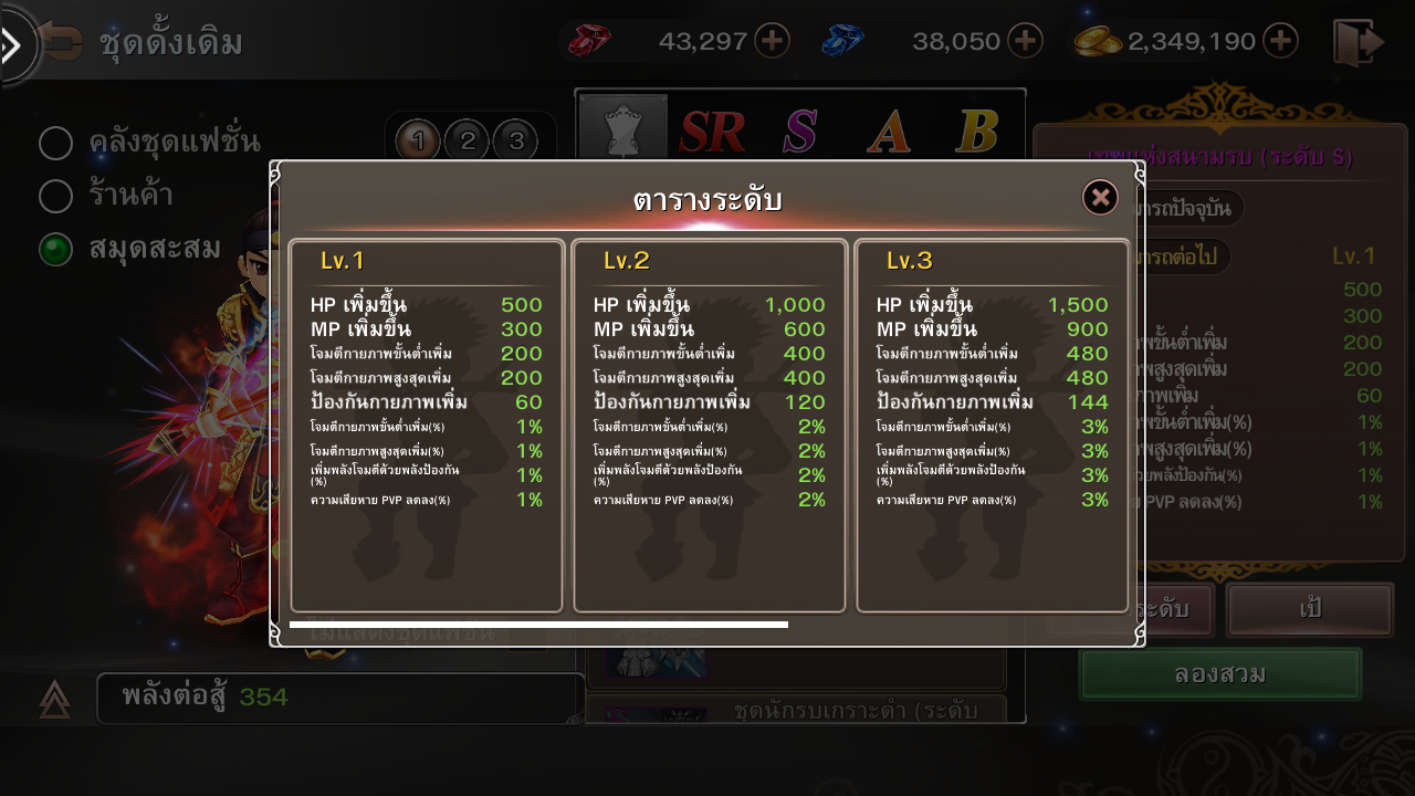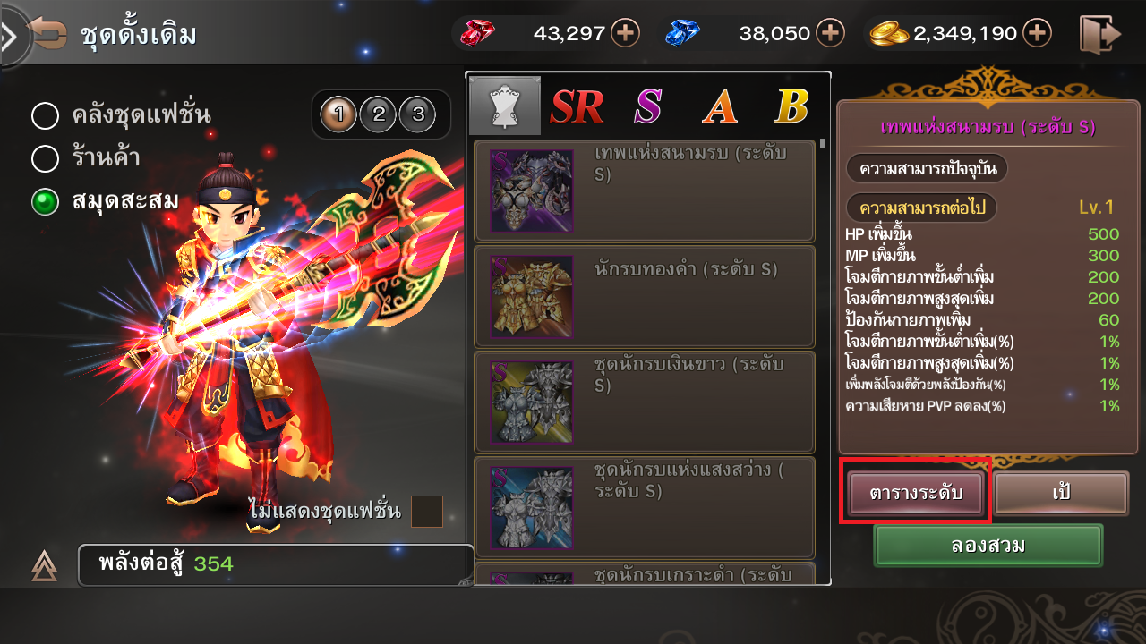 3. ปุ่ม ตารางระดับ มีไว้ตรวจสอบสถานะเลเวลของชุด เมื่อถึงระดับเลเวลค่าสถานะก็จะเพิ่มขึ้น