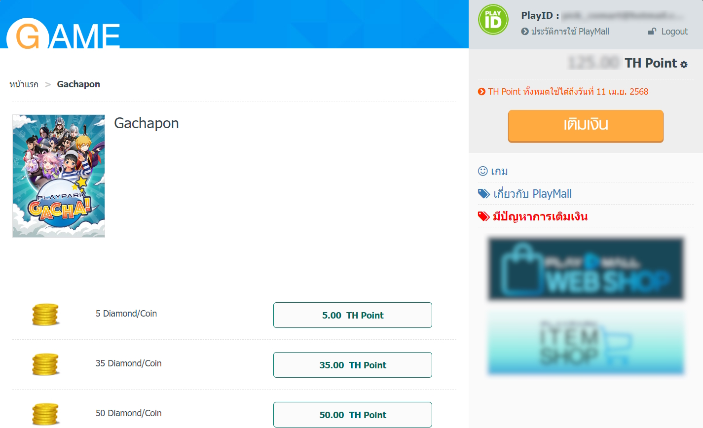 4. เติมเงินเข้าระบบ PlayMall เพื่อให้มีเงินในกระเป๋ากลางเพื่อใช้จ่าย (เมื่อเติมแล้วจะได้รับเป็น TH Point)