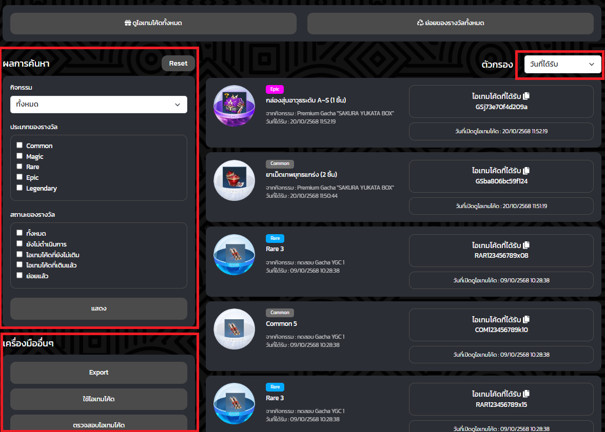 9. หากต้องการตรวจสอบไอเทมที่ได้รับสามารถใช้งานตัวกรองและผลการค้นหา โดยหัวข้อเครื่องมื่ออื่นๆ สามารถ Export File , ใช้ไอเทมโค้ด , ตรวจสอบไอเทมโค้ต