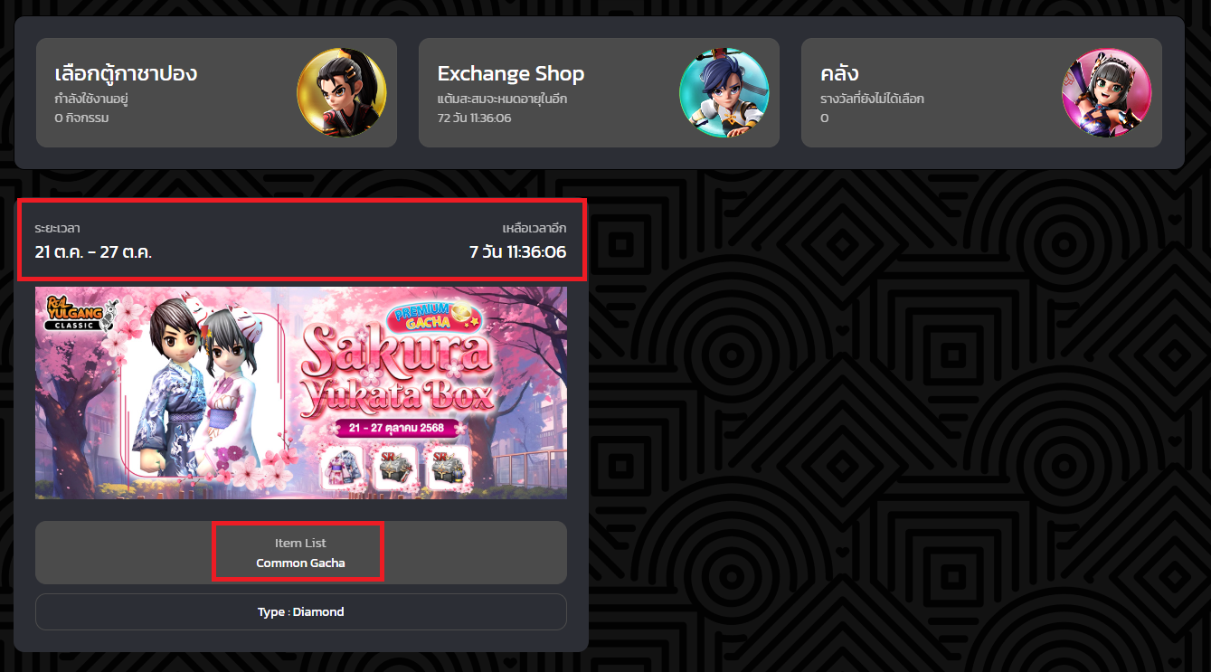4. เข้าสู่ระบบแล้วจะแสดงให้เห็นตู้ Premium Gacha ที่สามารถใช้งานโดยมีระยะเวลาบอก และสามารถตรวจสอบรายละเอียดไอเทมได้ที่ Item List
