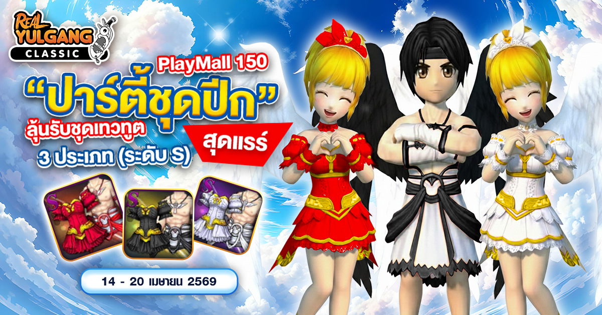 ข่าวสารทั้งหมด Yulgang Classic โปรโมชั่น โปรโมชั่น PlayMall 150 “ปาร์ตี้ชุดปีก” ลุ้นรับชุดเทวทูต 3 ประเภท (ระดับ S) สุดแรร์