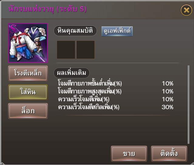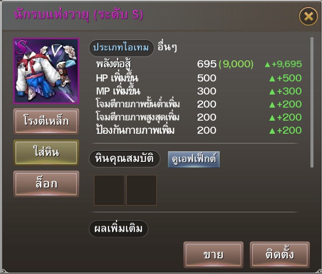 ชุด G. (ระดับ A) ผลเพิ่มเติม โจมตีกายภาพขั้นต่ำเพิ่ม(%) 5% โจมตีกายภาพสูงสุดเพิ่ม(%) 5% ชุด B. (ระดับ A) ผลเพิ่มเติม ป้องกันกายภาพเพิ่ม(%) 5% ชุด S. (ระดับ A) ผลเพิ่มเติม ได้รับค่าประสบการณ์เพิ่มขึ้น 5% ชุด P. (ระดับ A) ผลเพิ่มเติม ได้รับทองเพิ่มขึ้น 5% |