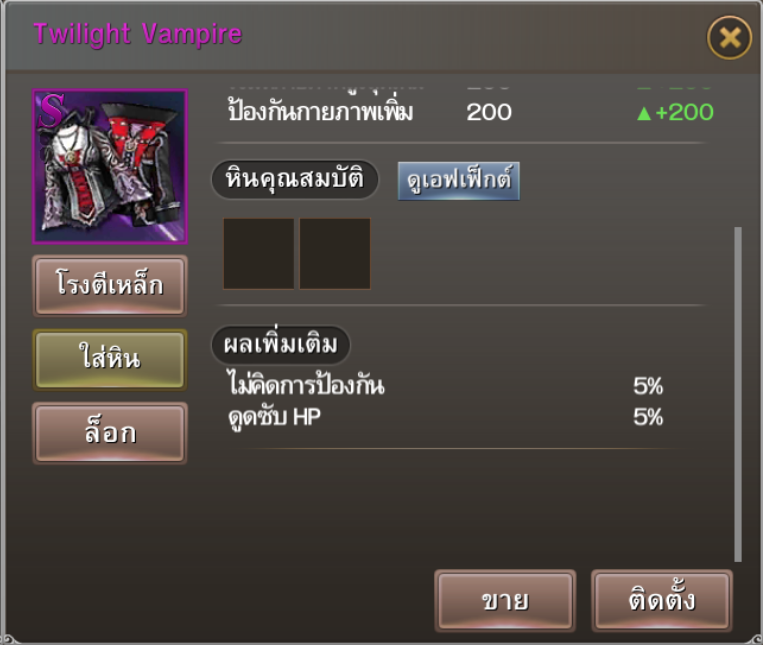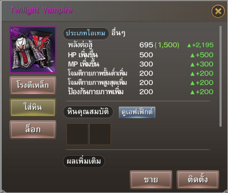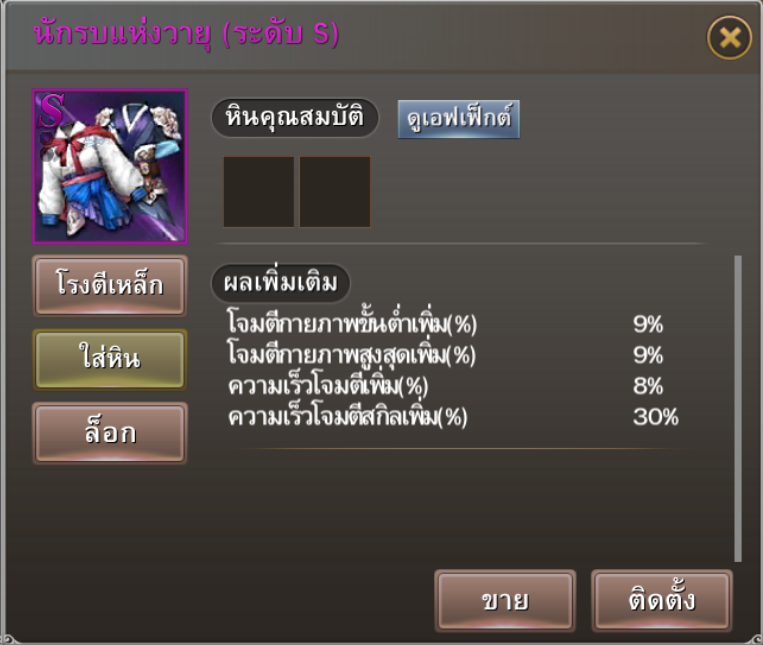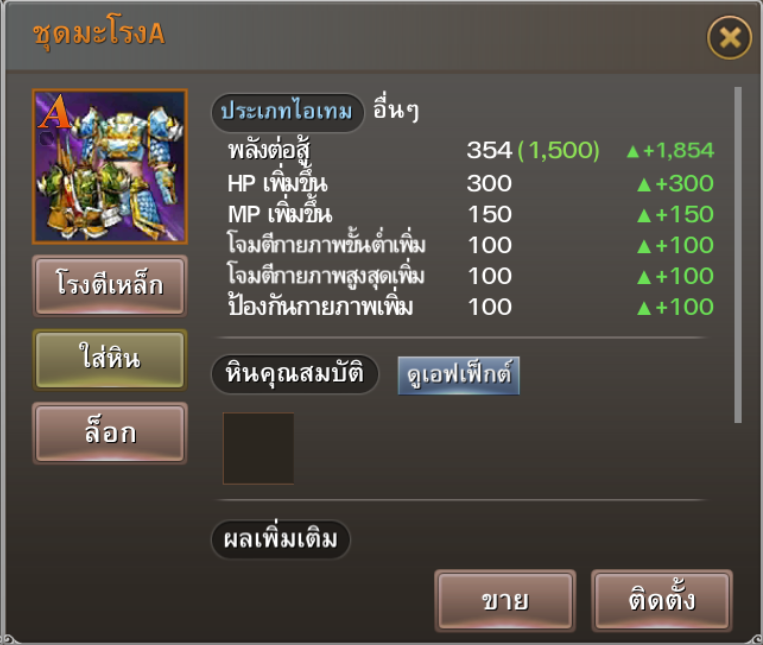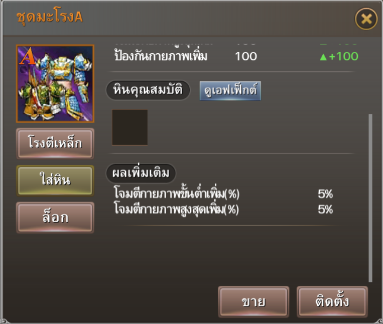 ชุด G. (ระดับ A) ผลเพิ่มเติม โจมตีกายภาพขั้นต่ำเพิ่ม(%) 5% โจมตีกายภาพสูงสุดเพิ่ม(%) 5% ชุด B. (ระดับ A) ผลเพิ่มเติม ป้องกันกายภาพเพิ่ม(%) 5% ชุด S. (ระดับ A) ผลเพิ่มเติม ได้รับค่าประสบการณ์เพิ่มขึ้น 5% ชุด P. (ระดับ A) ผลเพิ่มเติม ได้รับทองเพิ่มขึ้น 5% |