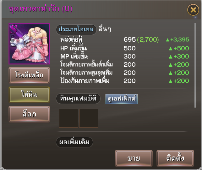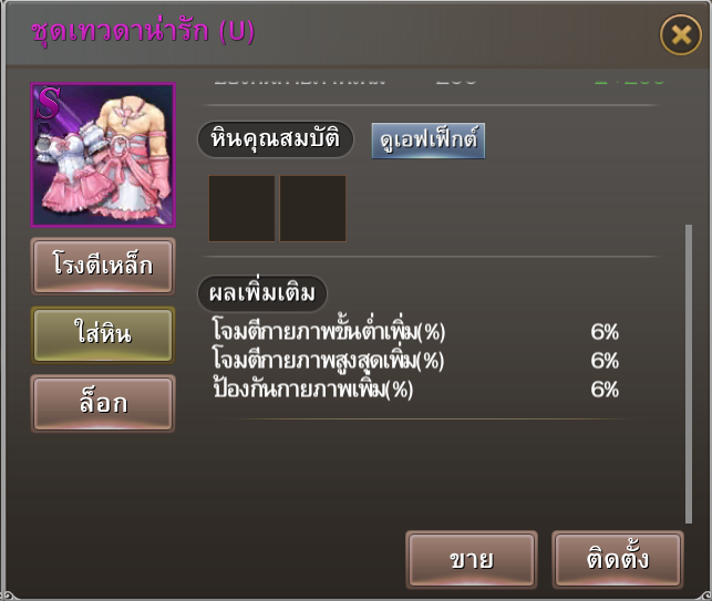 ชุด G. (ระดับ A) ผลเพิ่มเติม โจมตีกายภาพขั้นต่ำเพิ่ม(%) 5% โจมตีกายภาพสูงสุดเพิ่ม(%) 5% ชุด B. (ระดับ A) ผลเพิ่มเติม ป้องกันกายภาพเพิ่ม(%) 5% ชุด S. (ระดับ A) ผลเพิ่มเติม ได้รับค่าประสบการณ์เพิ่มขึ้น 5% ชุด P. (ระดับ A) ผลเพิ่มเติม ได้รับทองเพิ่มขึ้น 5% |